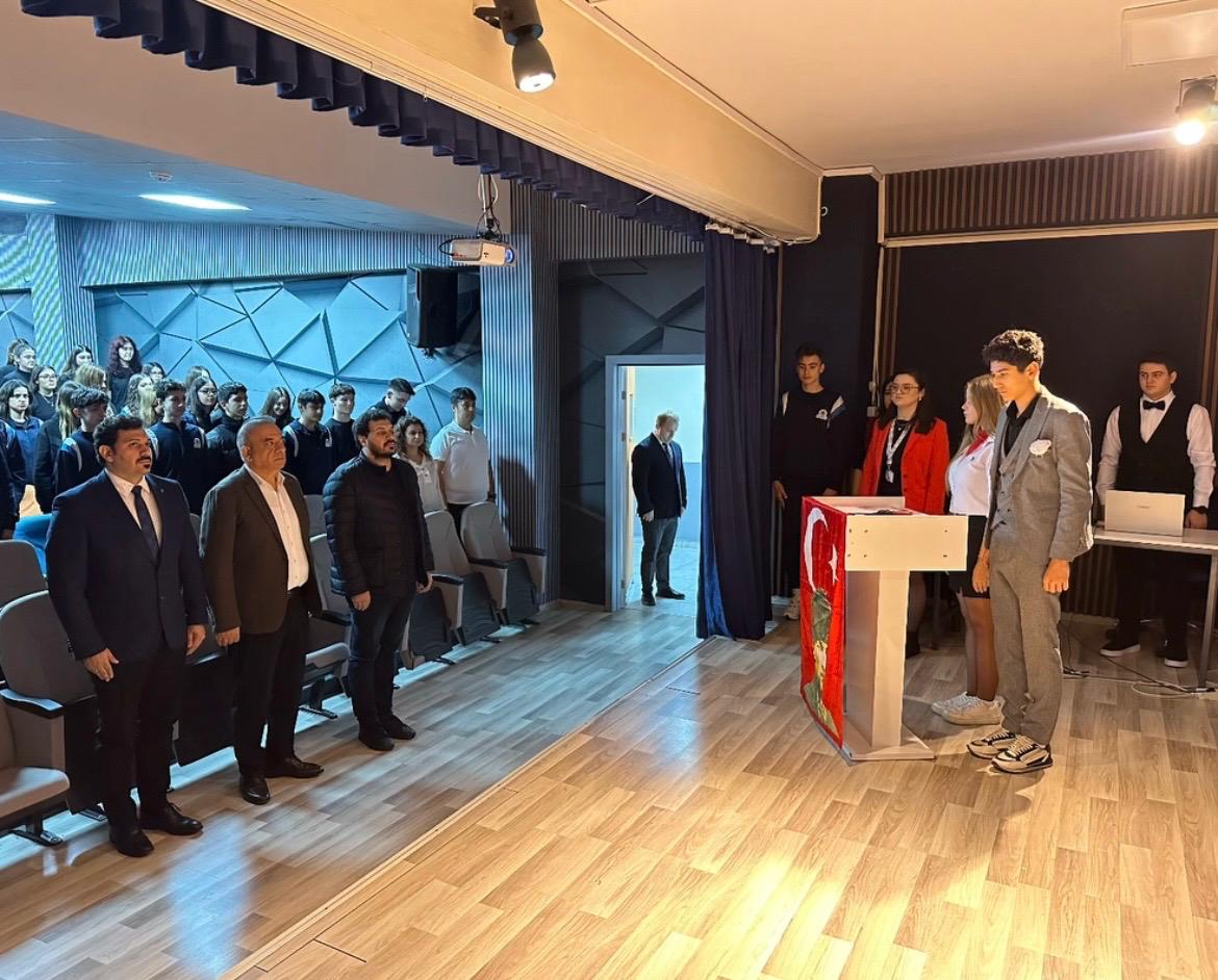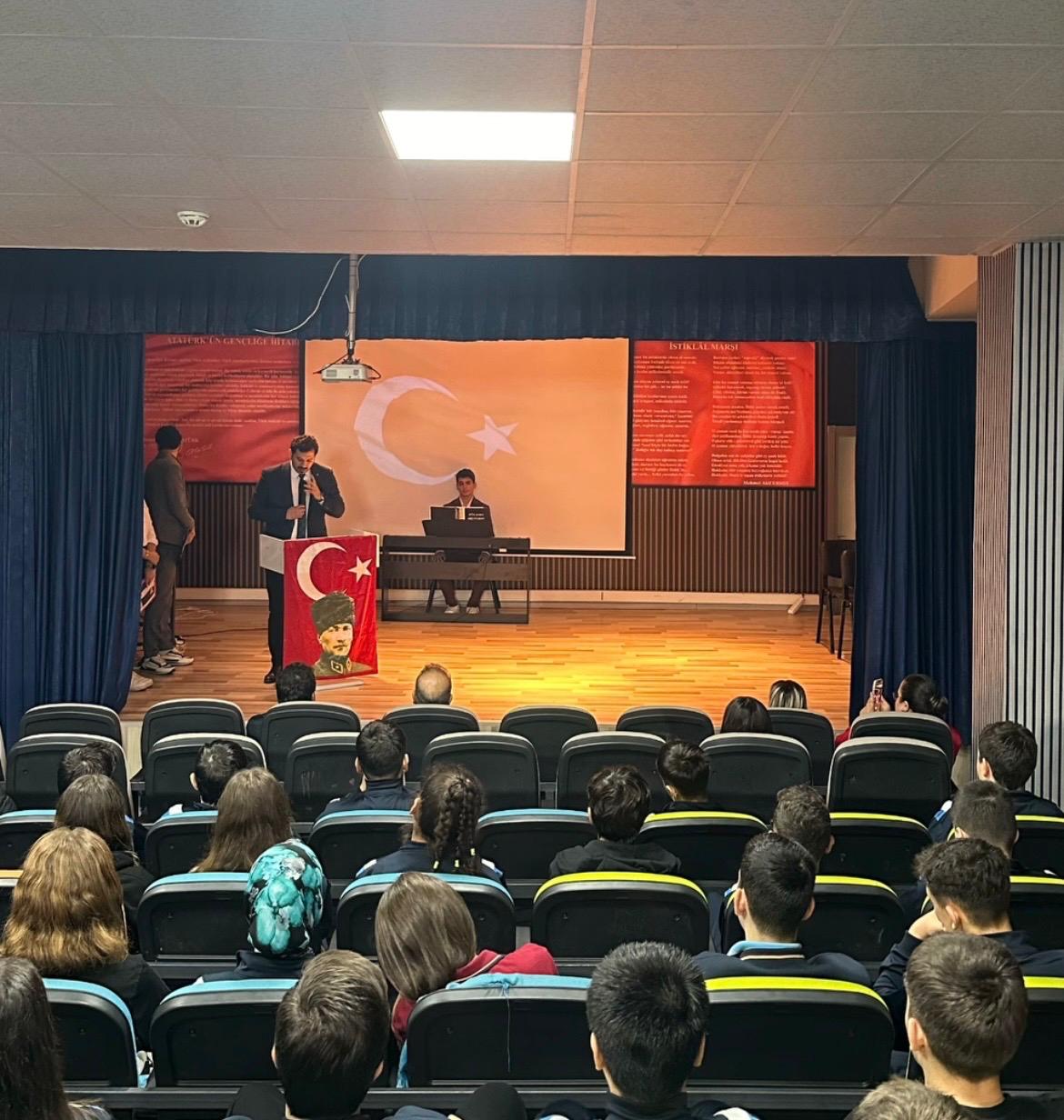 Okulumuzda, 29 Ekim Cumhuriyet Bayramı etkinlikleri kapsamında konferans salonunda öğrencilerimiz tarafından hazırlanan gösteri ve sunumlar büyük bir coşkuyla gerçekleştirilmiştir. Programda öğrencilerimiz; Cumhuriyetimizin ilan sürecini, önemini ve kazanımlarını anlatan sunumlar yapmış, şiirler ve çeşitli gösterilerle etkinliğe renk katmıştır. Öğrencilerimizin aktif katılımıyla gerçekleşen program, izleyiciler tarafından büyük beğeni toplamış ve Cumhuriyet Bayramı’nın anlam ve önemine yakışır bir atmosferde tamamlanmıştır. Bu anlamlı etkinlikte emeği geçen tüm öğrenci ve öğretmenlerimize teşekkür ederiz.